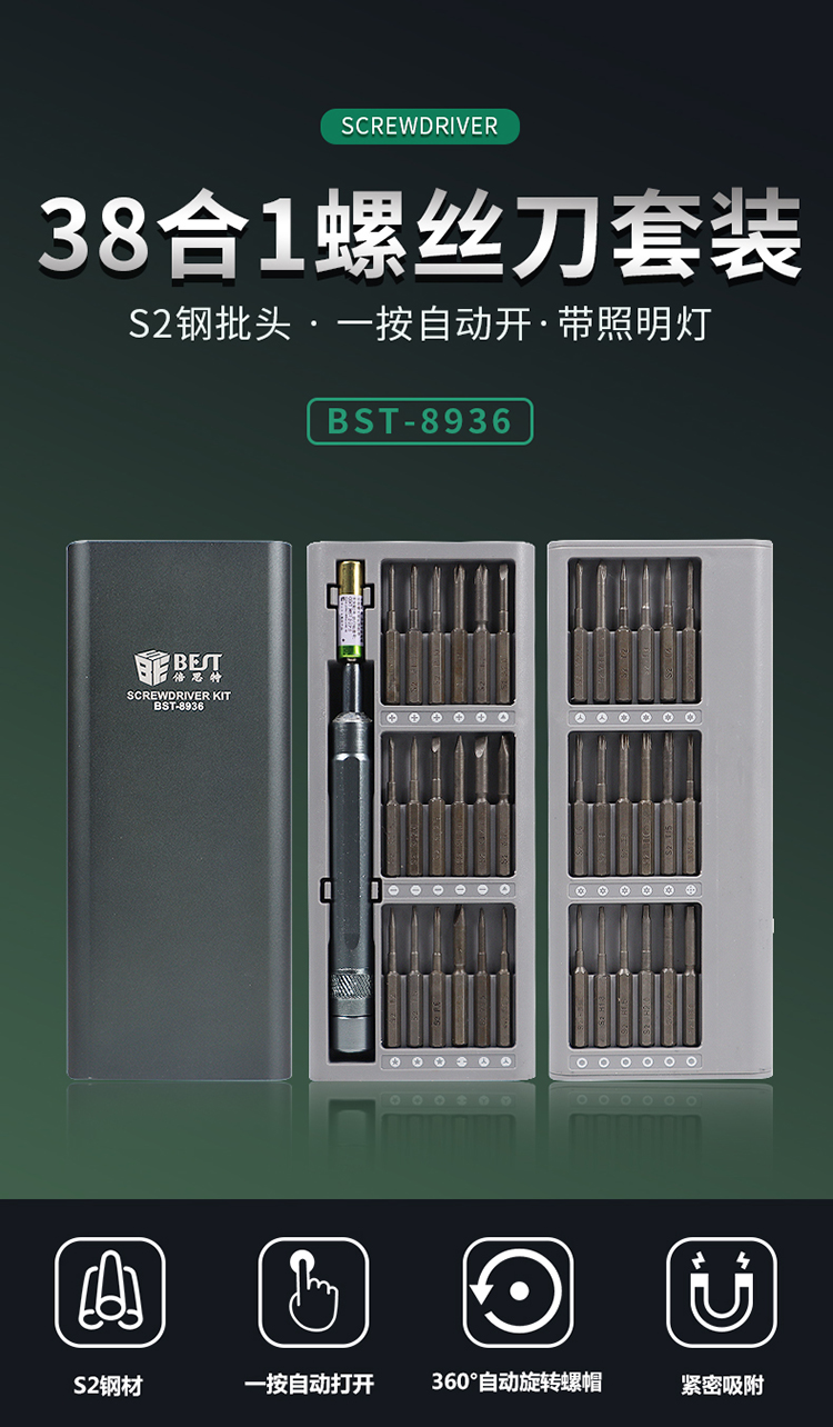 返回當前位置: 首頁 / 產品中心 / BST-8936 帶照明燈 38合一螺絲刀套裝 S2鋼磁性手機維修工具