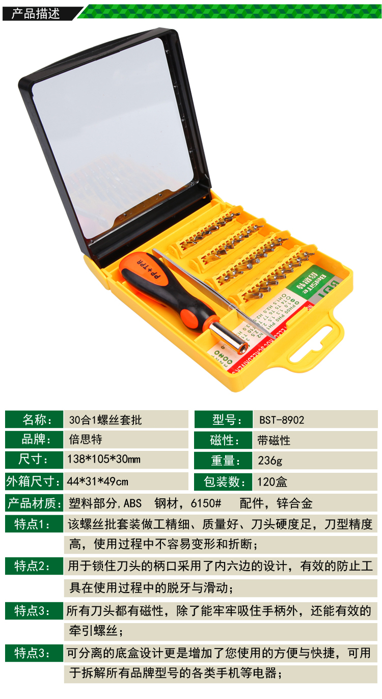 返回當(dāng)前位置: 首頁 / 產(chǎn)品中心 / BST-8902 螺絲套批 螺絲刀套裝30合1 專用電腦手機(jī)電子電訊維修工具