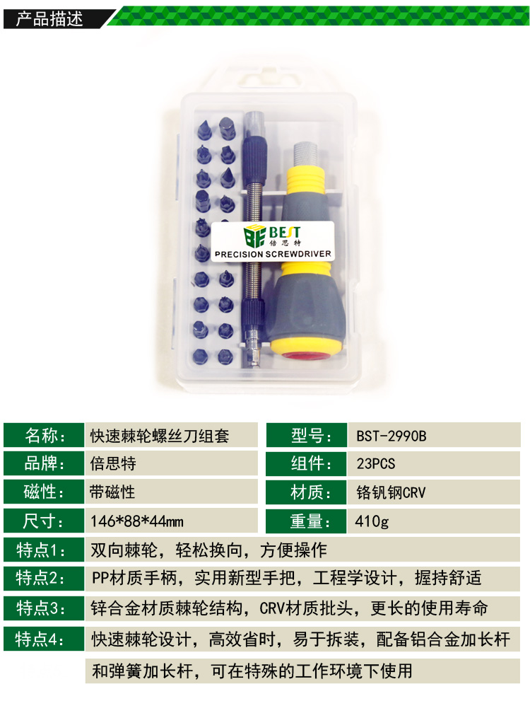 返回當前位置: 首頁 / 產(chǎn)品中心 / BST-2990B 23件套 快速棘輪螺絲刀組套