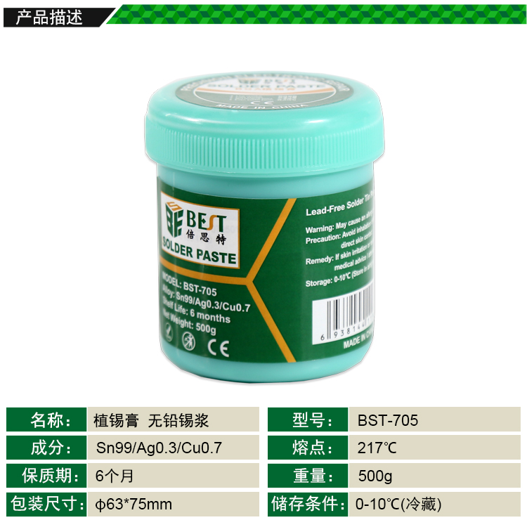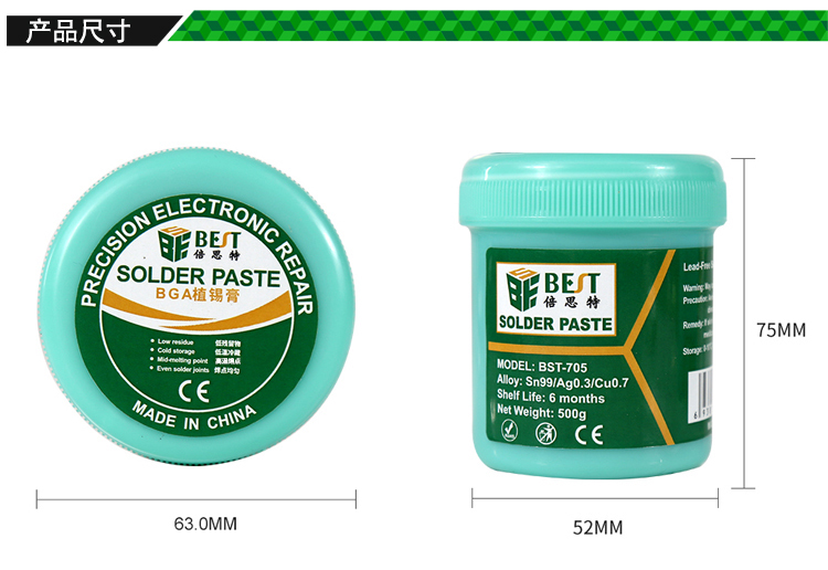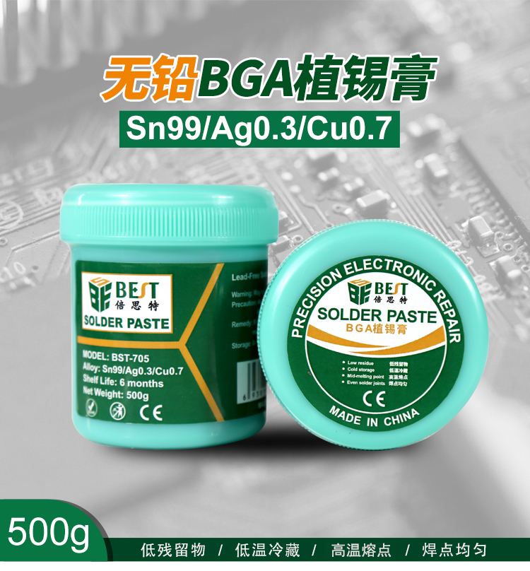 返回當(dāng)前位置: 首頁 / 產(chǎn)品中心 / BST-705 無鉛錫漿 高溫錫漿 焊錫膏 BGA植錫膏 Sn99/Cu0.7/Ag0.3 500g